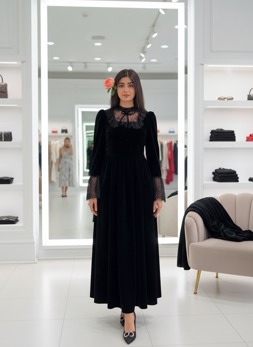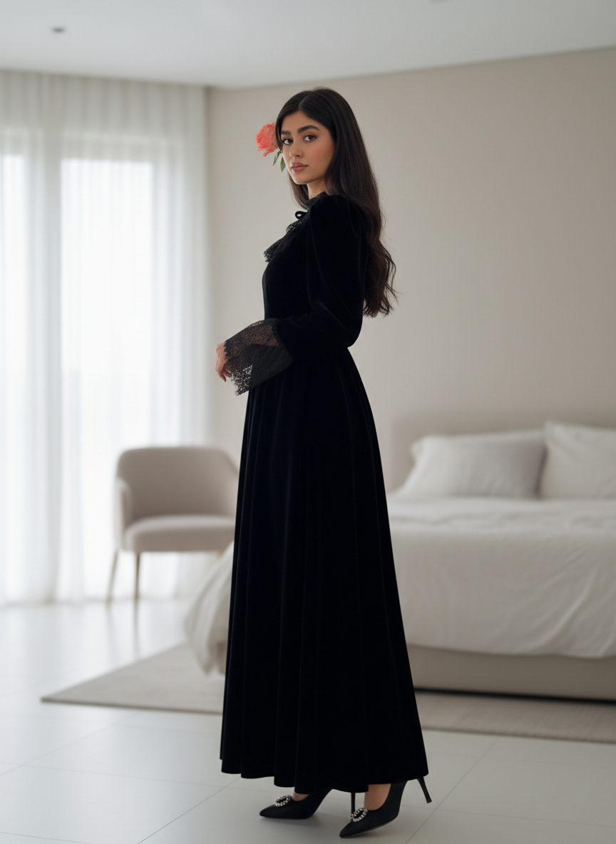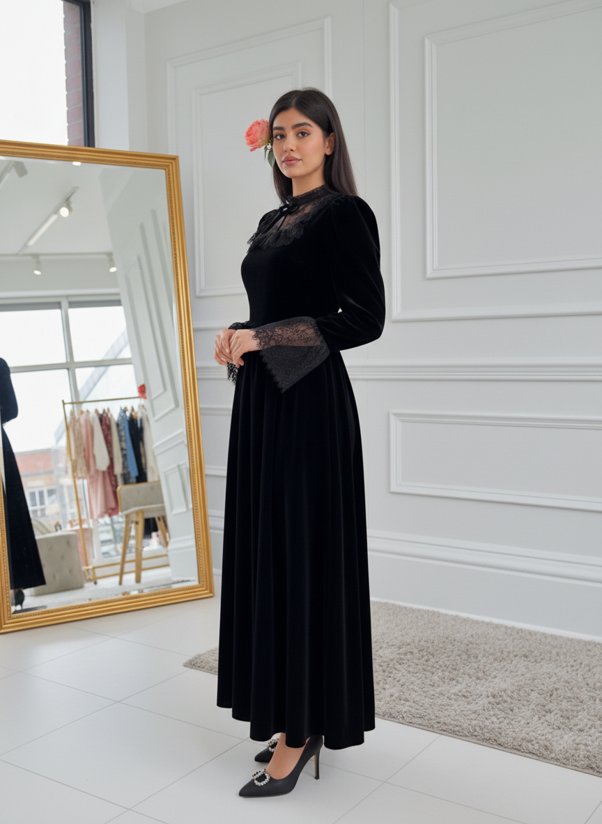 لكل وحدة تحب التميز والـ Class، جبنالك فستان يجمع بين فخامة القماش (Velours) ولمسة الدونتال الراقية. قطعة تخليك "الهمة والشان" في كل مناسباتك.